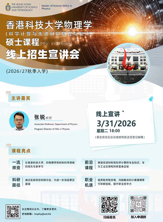 香港科技大学物理学(科学计算与先进材料物理与技术)理学硕士26FALL入学!线上招生宣讲会